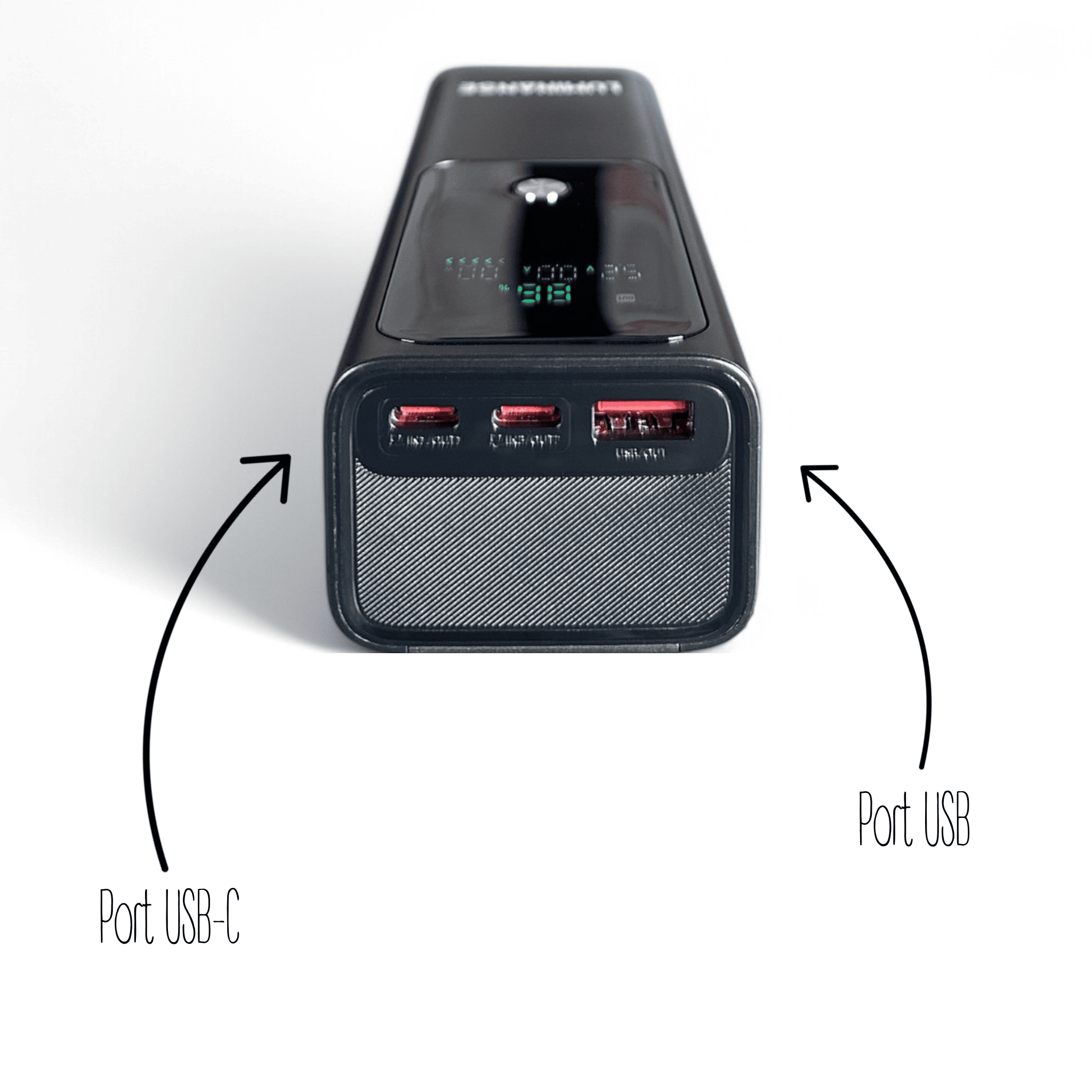 2. Utilisation de la Batterie : Pour charger un appareil, branchez-le au port USB ou USB-C de la batterie. L’écran digital indiquera la puissance et l’ampérage en temps réel. Grâce à sa sortie de 100W, cette batterie peut alimenter des appareils nécessitant une puissance élevée, comme un ordinateur portable.