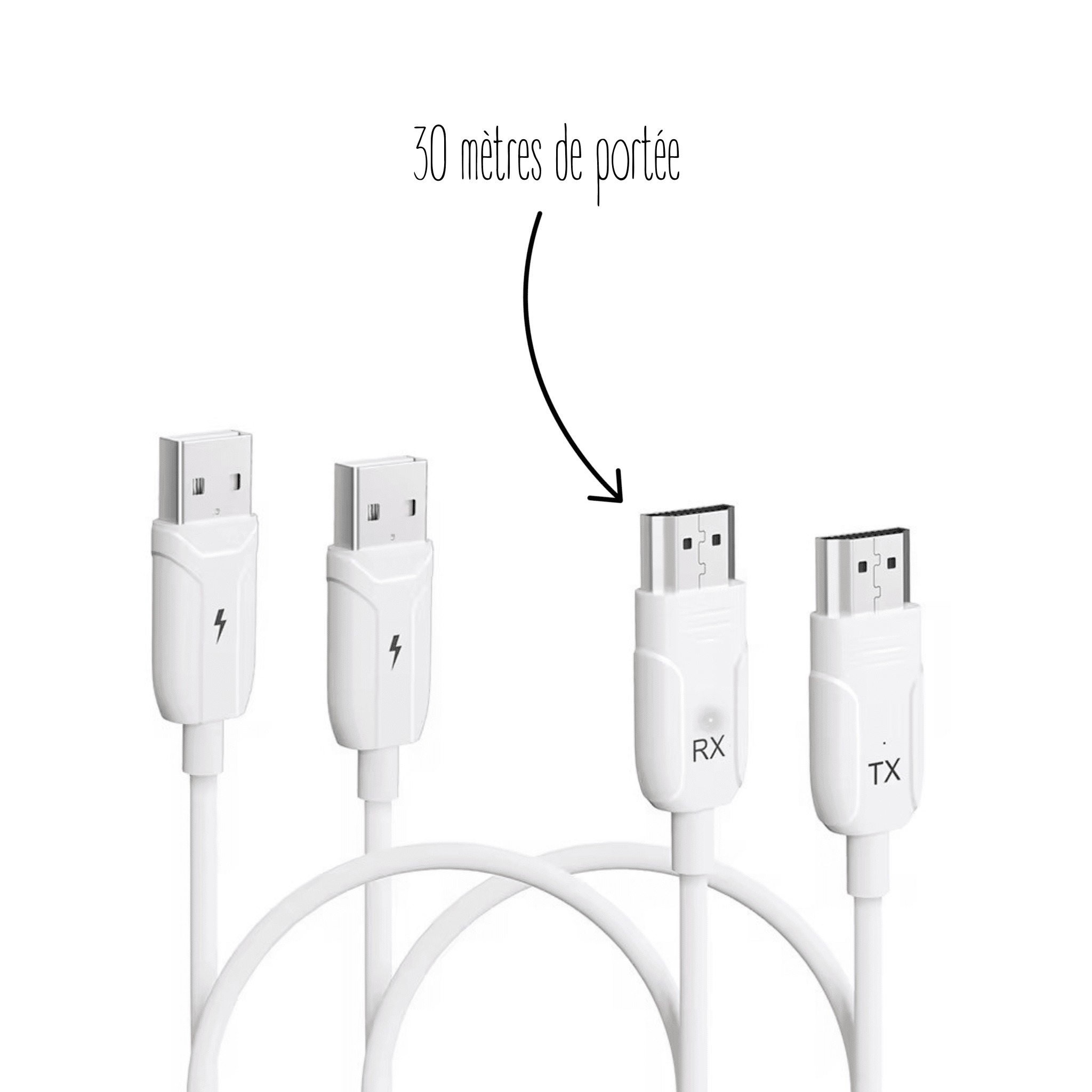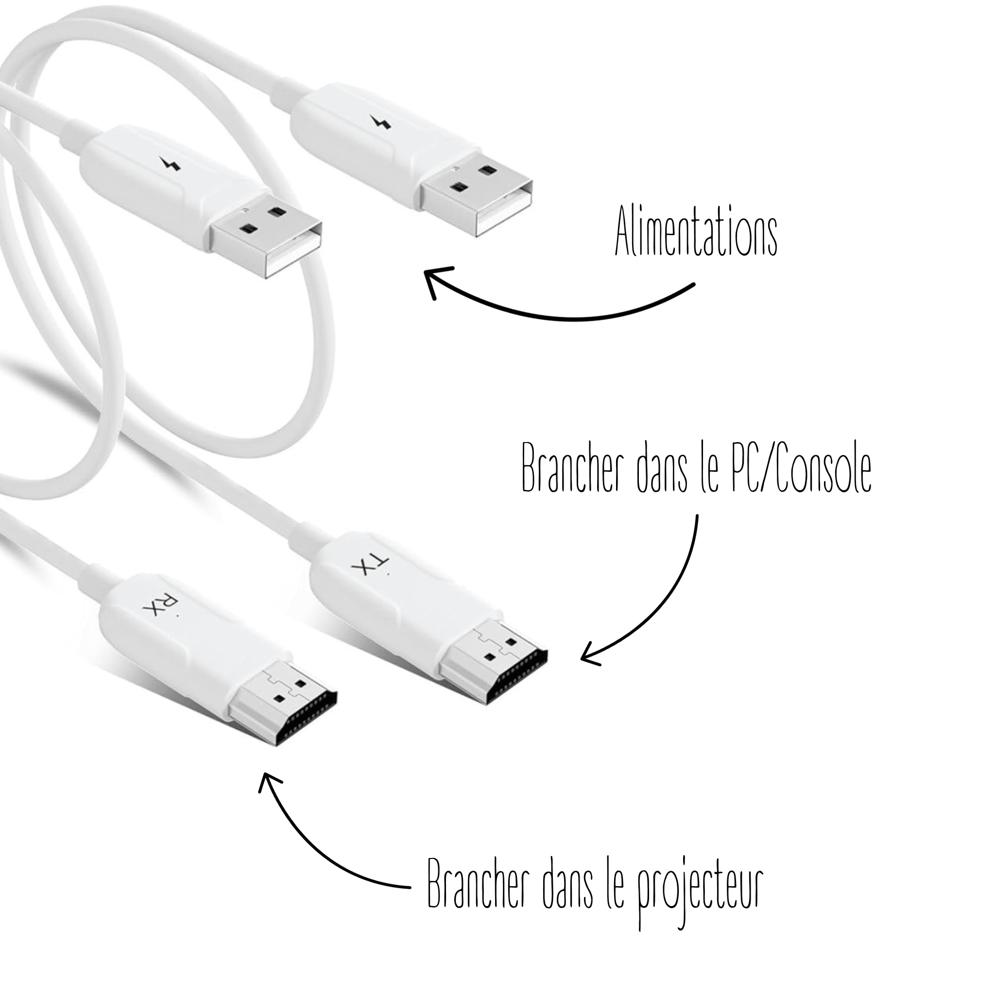 2. Connexion du Récepteur (RX): Branchez le récepteur (RX) dans le port HDMI de votre écran ou projecteur. Alimentez le récepteur en utilisant le câble USB ou l’adaptateur secteur fourni.